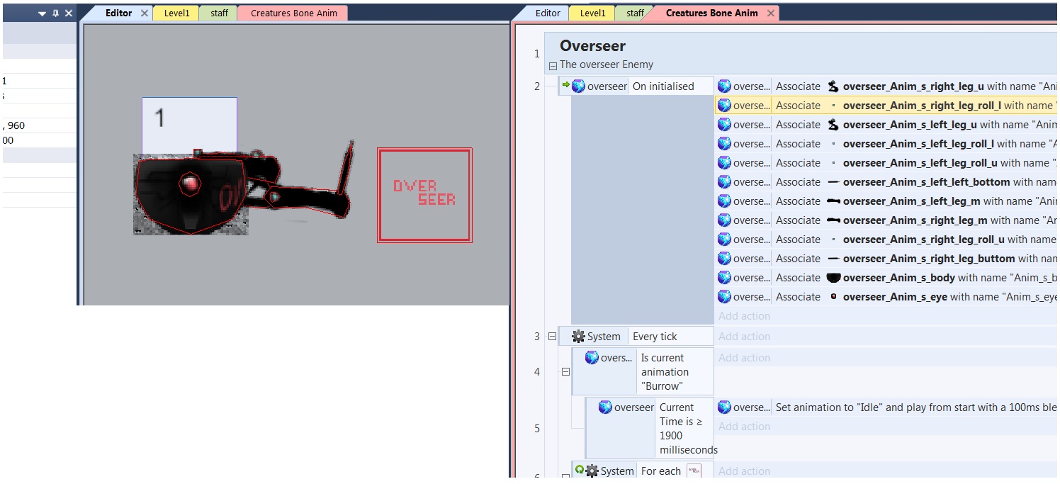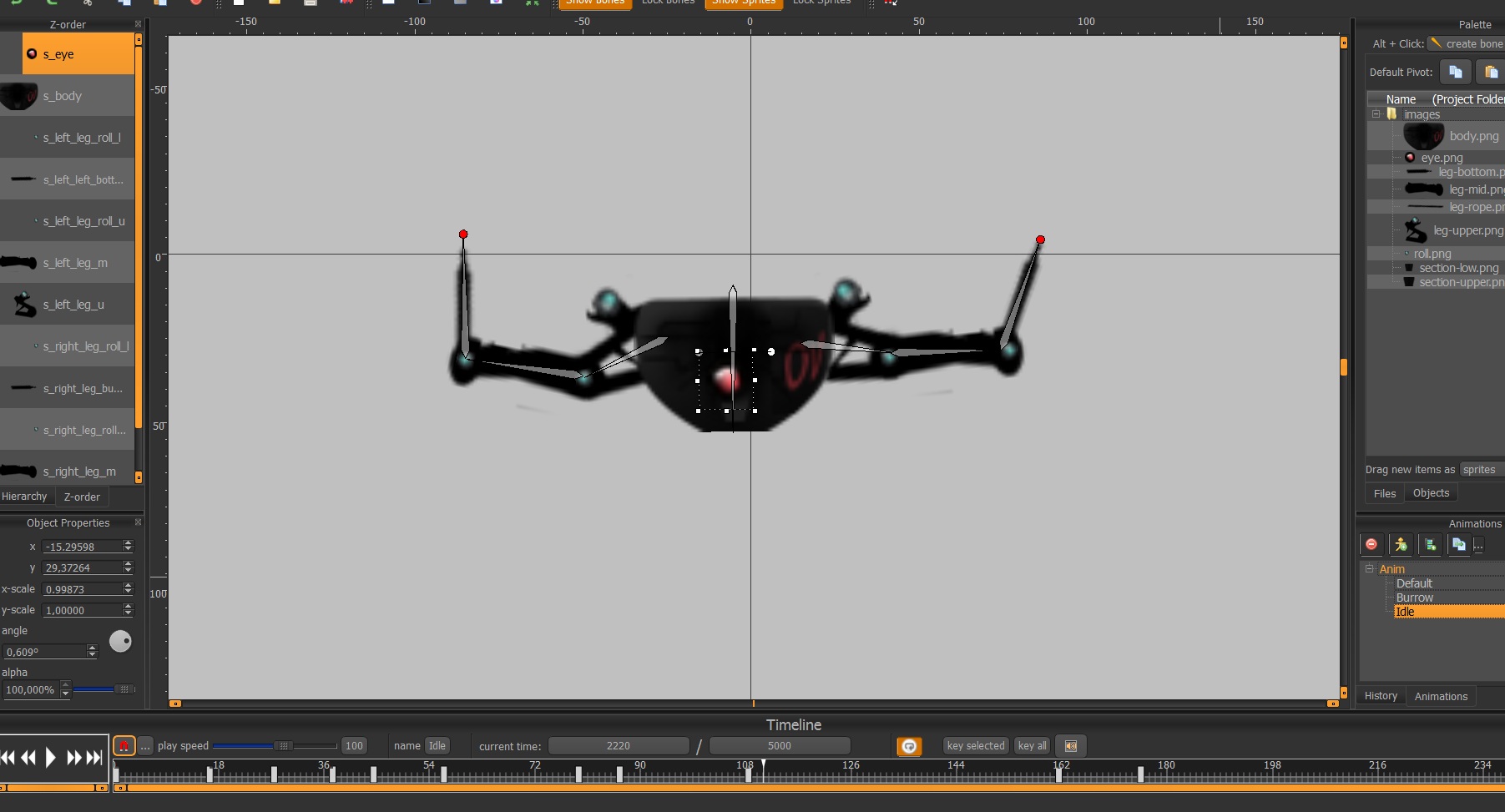 Затем используя костную анимацию, я делаю основные графические наброски. Каждая анимация начинается с базового пресета, который я заранее сделал. Анимации бывают обычные (idle, walk), специальные (burrow), и программные (частично анимируются, а частично программируются в зависимости от нужд геймдизайна).