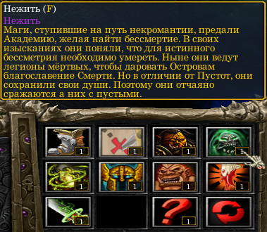 В новой версе - все юниты из кладбище вызываются за счет маны и трупов которые есть рядом ( так же на скелетов действуют все апгрейды , время жизни скелетов - 500 секунд , перезарядка призыва 8 секунд)