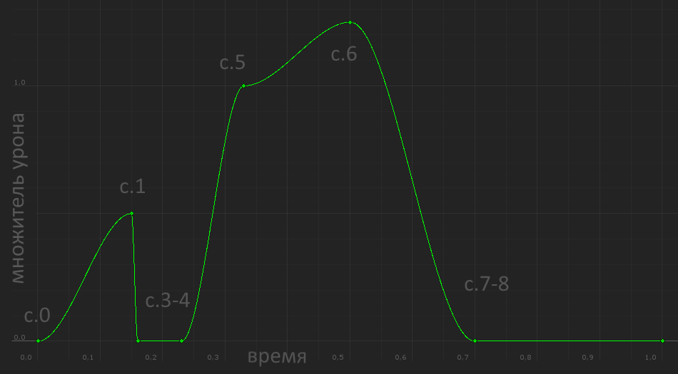 - выдача урона идет от процесса анимации согласно кривой (замах назад от 0-50%, мертвая точка 0%, удар до цели 0-100%)