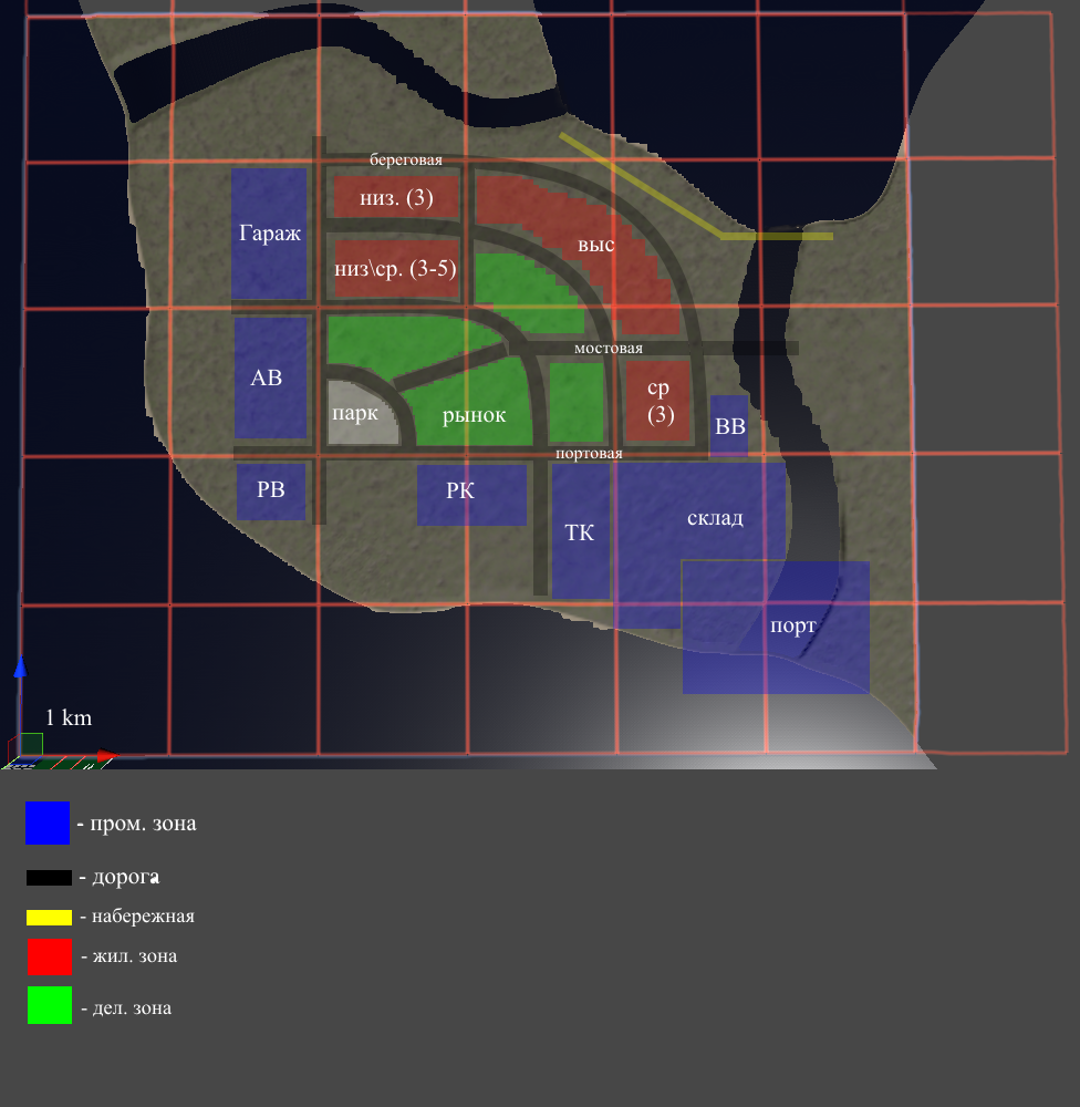 Для начала мы решили заполнить город на остове/полуострове длиной в 5 км. и в ширину 5 км. Ниже покажу примерный план города: