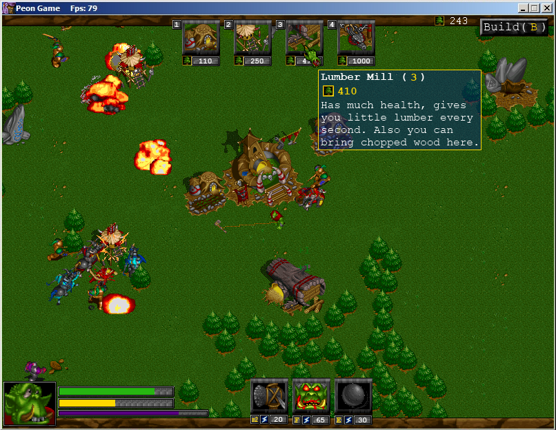 По нажатию на кнопку Build список зданий выплывает с верха экрана, и постройка зданий становится возможна по хоткеям (цифры) или с помощью мыши.