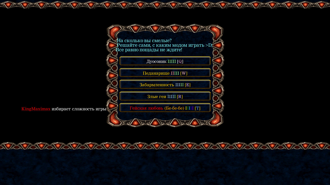 Как только ролики прошёл, или вы решили пропустить его, режим почтового ящика ещё не отключается, т.к. игрок красный избирает уклад игры. Как показано на сн. 3, игрок определяет сложность игры, каждая сложность имеет определённый процент предсказуемости, однако, не у всех боссов 100% непредсказуемость в их действиях. На сн. 4, показано на сколько должна быть ещё труднее игра, первая кнопа диалога сделана для криворуких и новичков. Каждая кнопка диалога переключает разные триггеры...