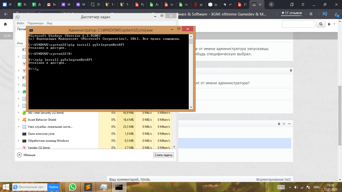 Хотел установить pyTelegramBotAPI для питона, вбил в консоль pip install pyTelegramBotAPI и и пишет,что отказано в доступе.