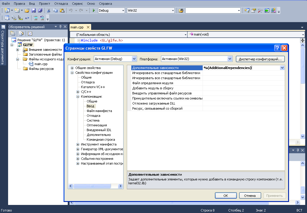 Для компиляции нашего приложения необходимо подключить библиотки opengl32.lib и glfw.lib