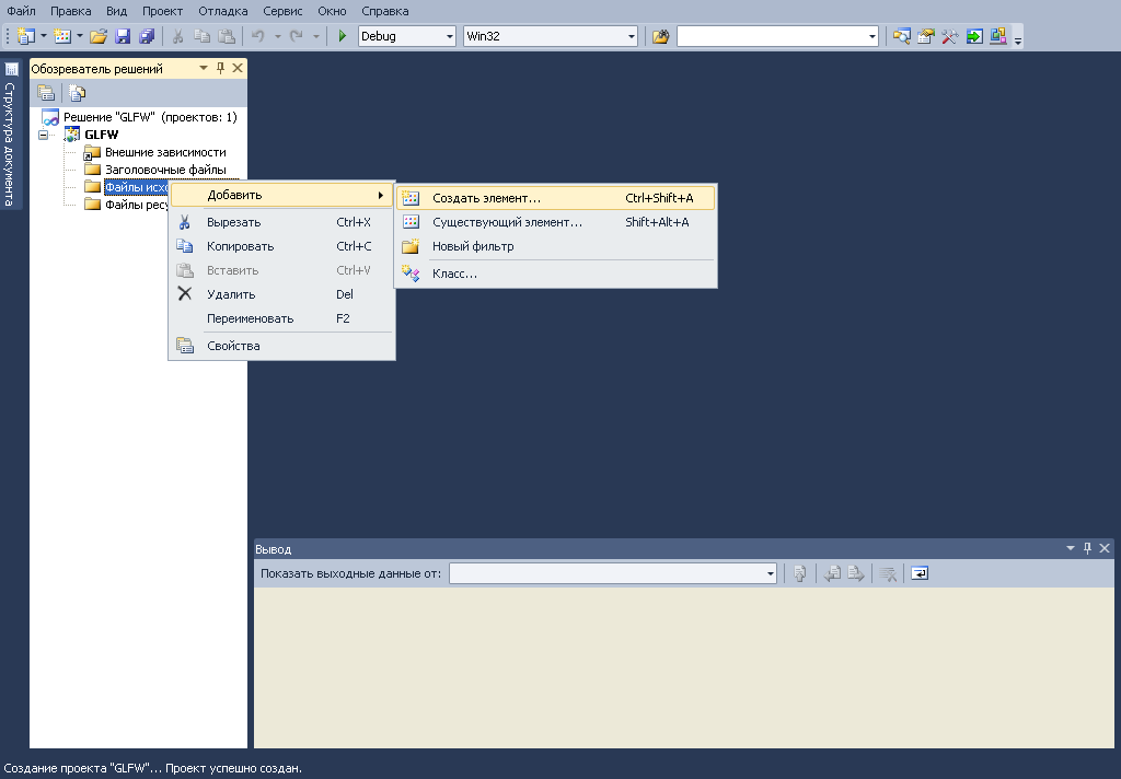 Нажимаем Готово.Перед нами открывается окно студии,в котором во вкладке слева "Обозреватель решений" расположен наш только что созданный проект,однако он пуст и все папки с Заголовочными файлами и Файлами исходного код пусты.Создадим новый файл исходного кода под названием main,для этого нажимаем правой кнопкой мыши по значку папки,подписанному Файлы исходного кода,выбираем пункт Добавить-Создать элемент