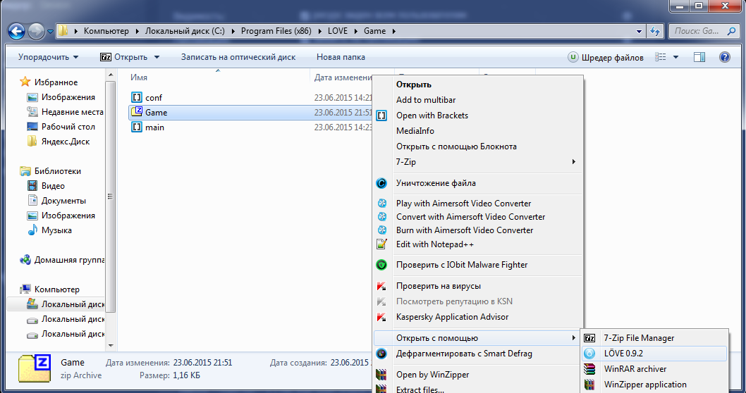 Во-вторых Love2D подготовила аж целых два варианта компиляции нашей программы. Вариант 1. Нам необходимо добавить два файла(main и conf) в ZIP архив и открывать этот архив программой Love2D,вот так:
