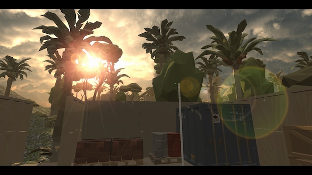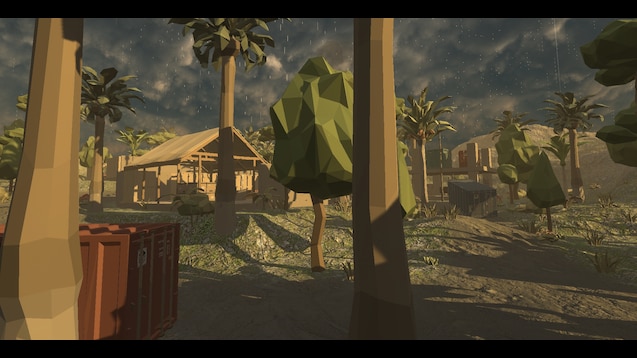 Военная база в джунглях среднего размера. Сражайтесь за 6 точек захвата под проливным дождём, используя для укрытия только недостроенные сооружения и деревья!