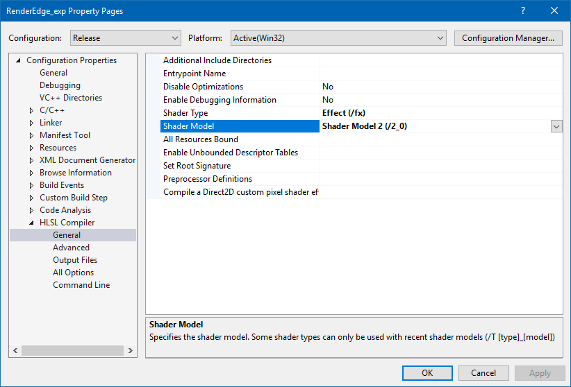Добавьте шейдеры в проект, в его свойствах настройте HLSL Compiler следующим образом: