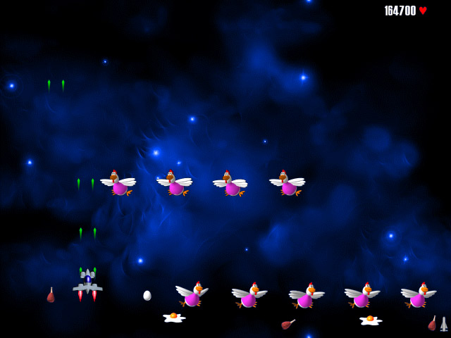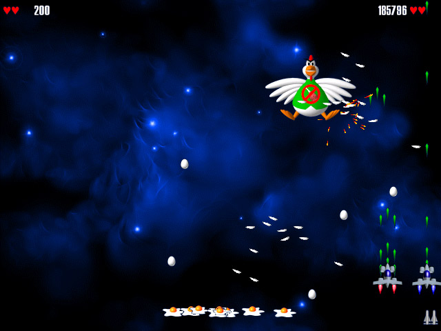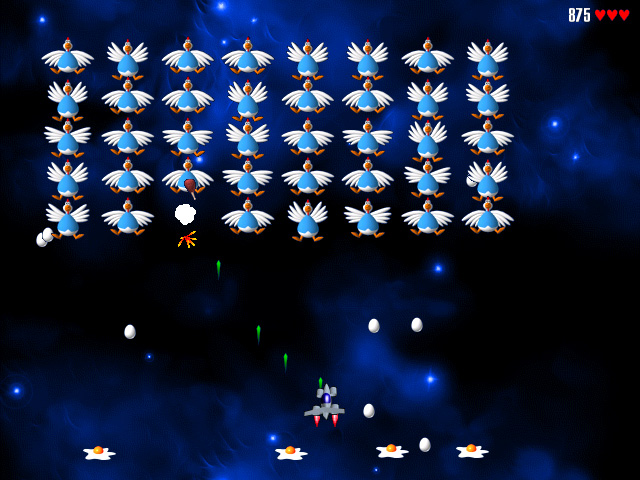 Действие игры разворачивается в космосе. С людьми, считающими себя властелинами вселенной, случилась страшная напасть. Орды свирепых куриц захватили Землю, и теперь только вам удастся спасти нашу планету. Вы можете спасти Землю в одиночку, а можете заручиться помощью верного друга, ведь игра поддерживает режим игры для 2 игроков на одном компьютере!