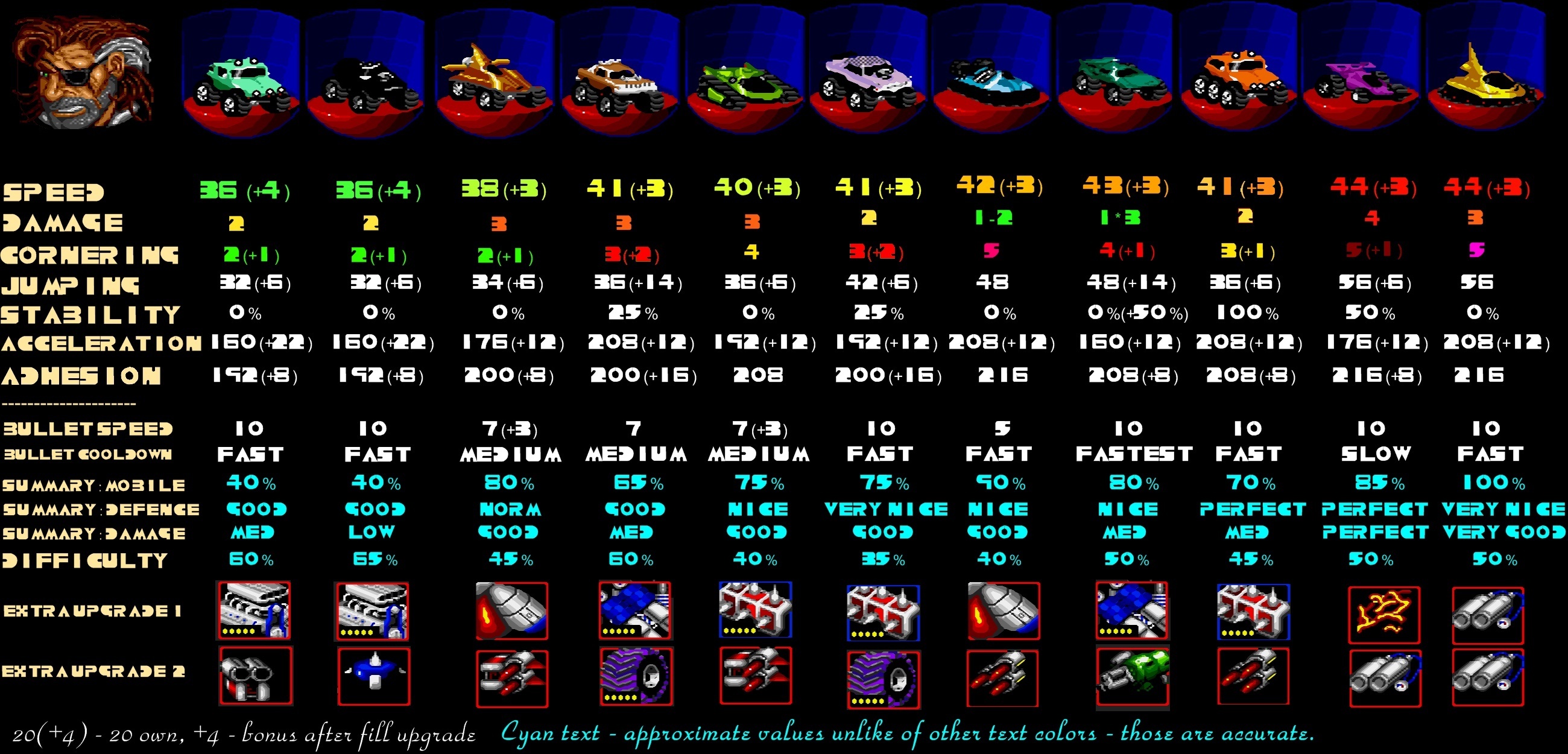 З.Ы. Подвеска 5-ого уровня: немного увеличивает и высоту прыжков при их использовании. Броня 5-ого уровня: также увеличивает и силу тарана. Нитро также увеличивает скорость машины на время действия(в оригинале такого не было). Гипернитро дополнительно увеличивает скорость машины на время действия.