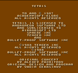 Помимо версии от Nintendo, на NES выходило множество различных версий, с разнообразной музыкой, специальными модификациями, другими фигурами и т.д. На фоне всех других версий Тетриса для Денди хочу отметить версию от Bullet-proof Software, так как музыка в ней хорошая и сделана она в русском стиле. Особо ничем не отличается от версии Nintendo, разве что управление более неудобное. Так как эта версия может некоторым придётся по душе, то выкладываю её в архиве вместе с версией от Nintendo (версия "J", у Nintendo "U"), также прикладываю скриншоты и видео этой версии.