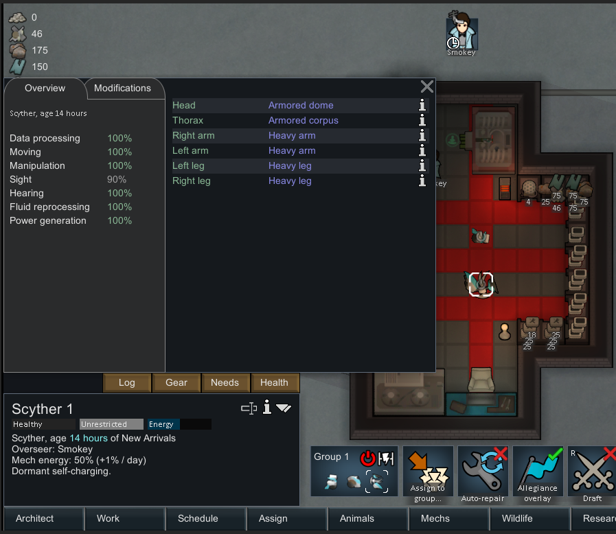 Модификации создаются в кодировщике подядра и могут быть установлены на механоидов через вкладку здоровья модификаций.