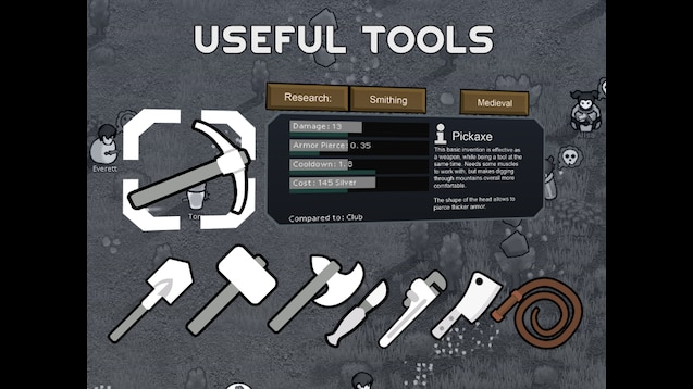 В этом моде вы найдете просто тонну разномастного оружия. Доисторическое, средневековое, современное и даже оружие будущего. Помимо этого есть ещё инструменты, которые можно использовать в качестве оружия.