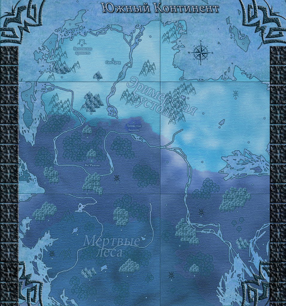 Южный континент - 20% пустыни, 50% леса и болота, 10% поля, 20% поглощенные неизвестной силой земли, при этом она разрастается. На этом континенте расположено государство людо-ящеров(в основном на поверхности), под землей строятся демонические государства.