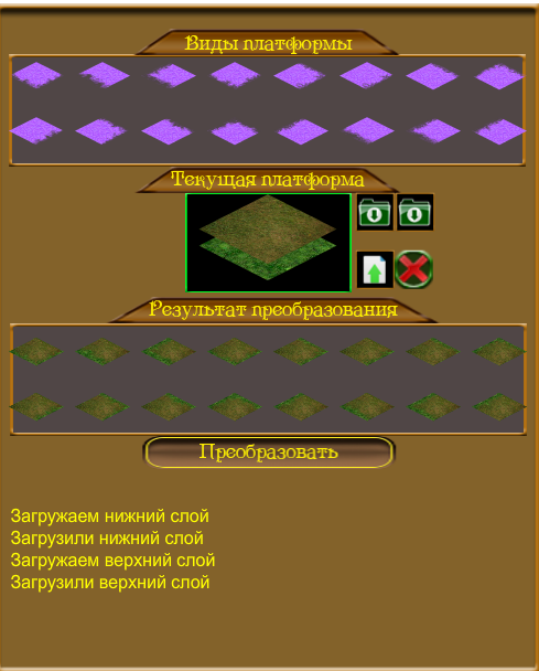 Как то одним вечером, дай думаю поделаю тайлы платформ для игры. На каждую платформу создается 16 подвидов. Я сделал таких 3 вида, посмотрел на часы и подумал, ну его нафиг вручную это делать. Думаю, дай ка может замучу редактор тайлов, который всё сделает за меня, чтобы поменьше возни было. Профит! Потратил на него пару дней, но сохранил уйму геморойных часов. Знакомьтесь, Rise of the dark lords - Редактор тайлов v1.0. Соединяем две любые текстуры и получаем целый сет платформ) В будущем можно будет добавлять всяческие камушки, травушки и прочего рода элементы, дабы разнообразить игровую карту и сделать её более приятной на вид.