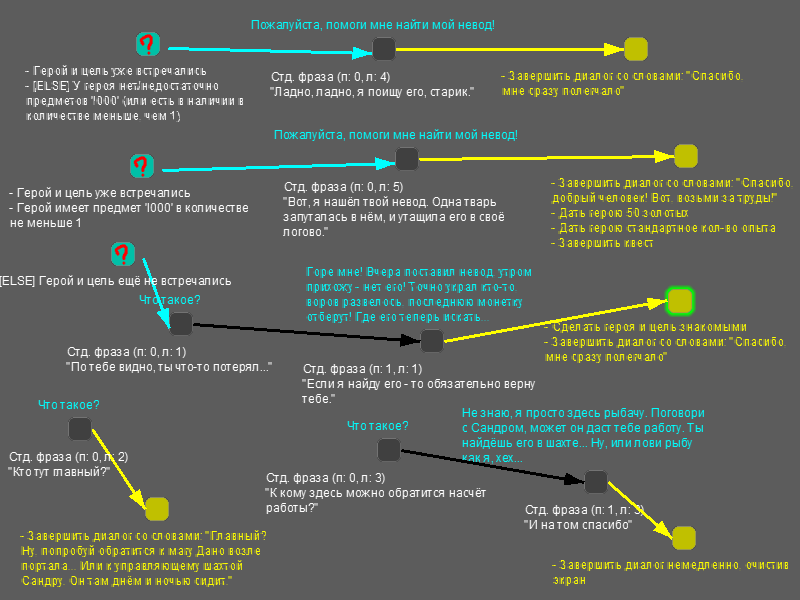 Итак, разработка проекта на некоторое время застопорилась, по одной банальной причине - сложность написания диалогов (отсюда и низкая скорость разработки). Напомню, для тех кто не в курсе - моя диалоговая недосистема была способна лишь выводить на экран фразы и отлавливать ответы на них, саму логику нужно было реализовать вручную. От этого у меня просто опускались руки - шутка ли, написать таким образом ещё огромное количество диалогов, как на первоначальной задумке.