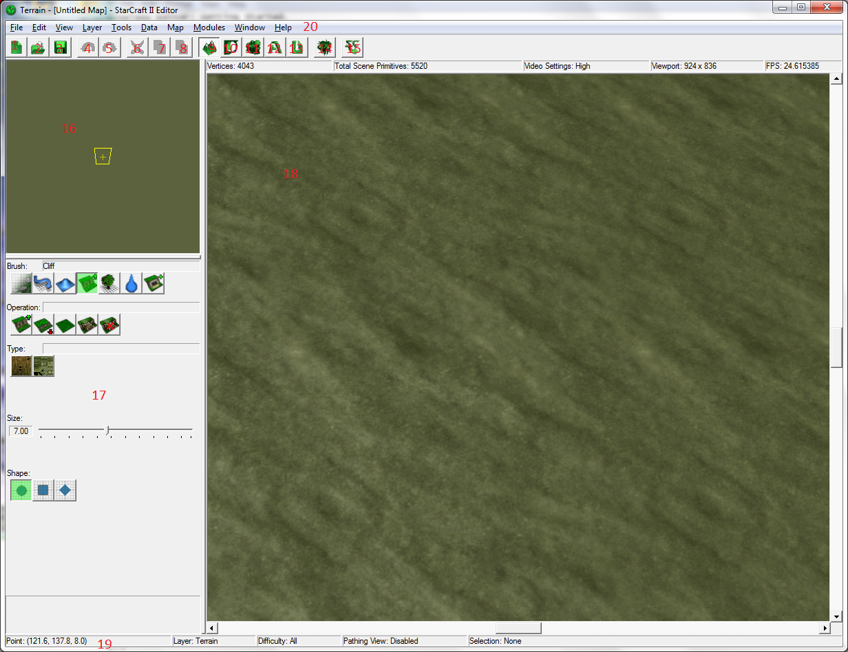 - Редактор ландшафта (англ. Terrain Editor) - запуск редактора ландшафта (он же - главное окно редактора). Здесь можно изменять ландшафт, размещать боевых единиц, декорации, добавлять точки и области, настраивать камеры, а также настраивать пути (англ. pathing). __Горячая клавиша__: [F5]