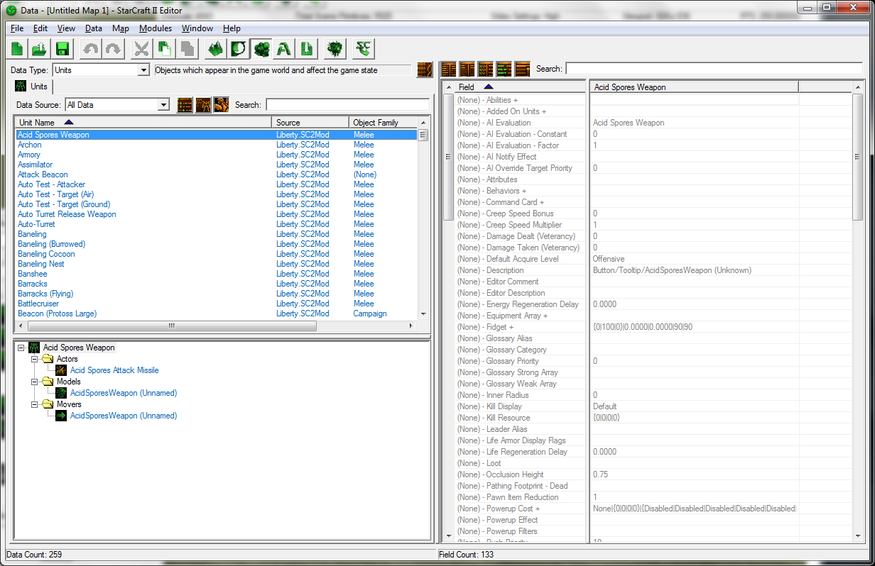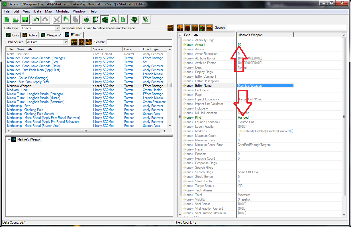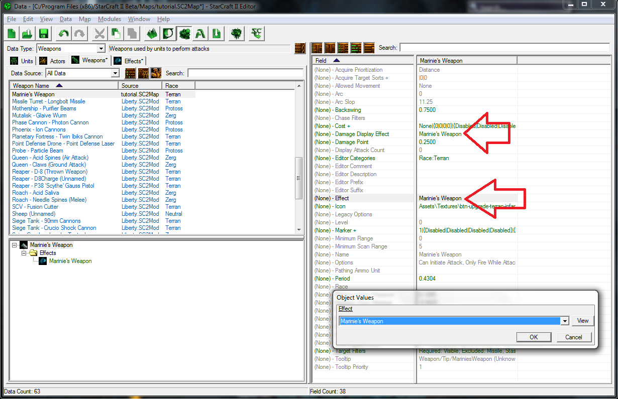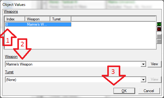 Откроем список юнитов, выберем нашего "Marinie", в поле Weapons выполним двойной клик на Value. Откроется окно с одним единственным вариантом. Жмем на него и в выпадающем меню выбираем Marinie's Weapon.