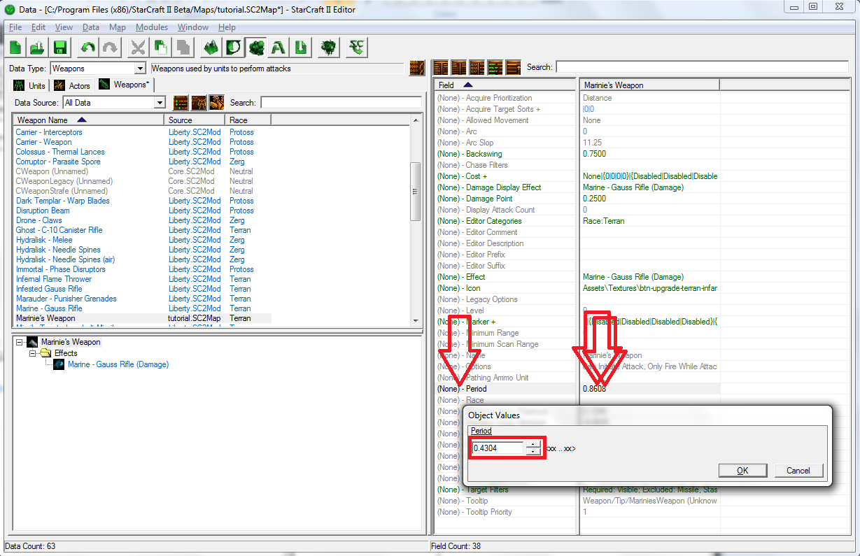 Нажимаем ОК. Теперь, чтобы изменить свойства нашего оружия, ищем поле Period (Период) и выполняем двойной клик мышью на столбце Value. Изменив значение по умолчанию, уменьшив его в 2 раза. Нажимаем ОК. Таким образом, частота стрельбы будет вдвое больше.