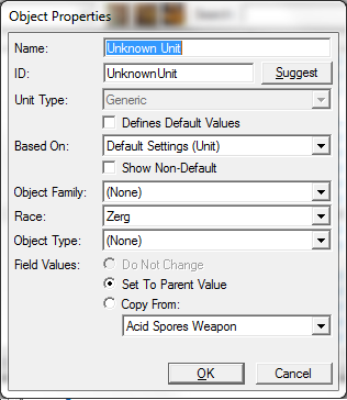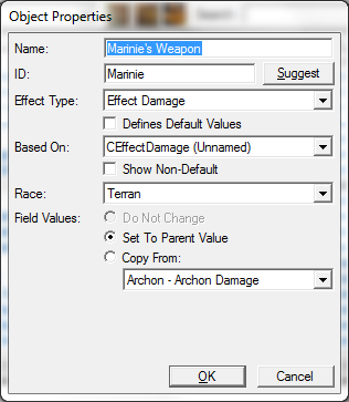 Нажимаем правой клавишей мыши в списке объектов, снова выбираем *Add Object*. Назовем его Marinie's Weapon. Вручную установим ID - "Marinie" (для красоты и порядка). Задаем Effect Type = Effect Damage, раса = Terran, завершаем процесс нажатием ОК.