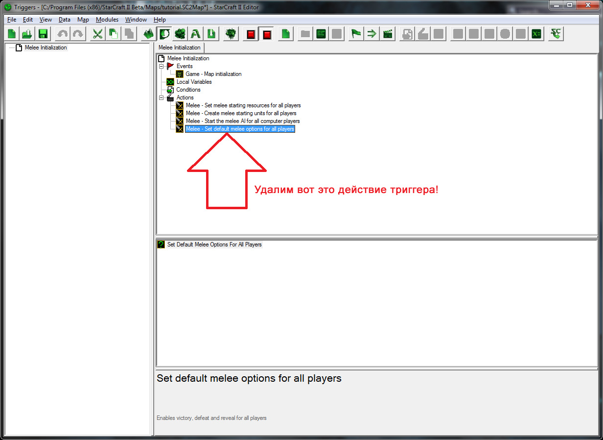 Выбираем и удаляем действие "Melee - Set default melee options for all players"