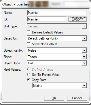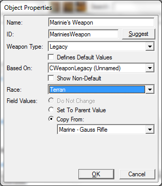 В Редакторе данных выберем Data Type - Weapons (Тип данных - Оружие). Выполнив правый клик мыши в любом месте списка, в выпадающем меню выбираем Add Object (Добавить объект). Назовем его Marinie's Weapon. Нажимаем кнопку Suggest напротив поля ID, ставим расу Terran и Copy From -> Marine - Gauss Rifle. Подробнее - на скриншоте.