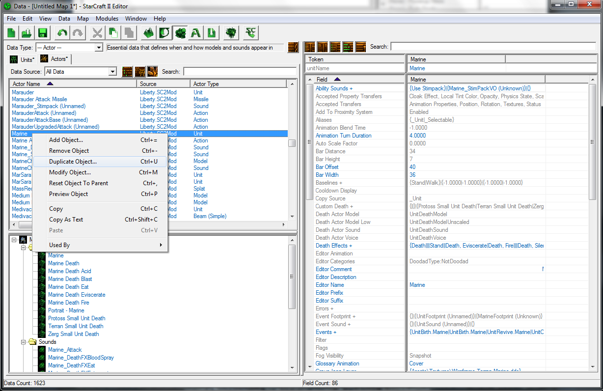 Снова перейдем в Редактор данных, в поле Data Type (Тип данных) выберем Actors. Откроется новая панель с множеством объектов. Листая список, находим строку "Marine", нажимаем на ней правой клавшей мыши и в выпадающем меню указываем пункт Duplicate Object (Дублировать объект).