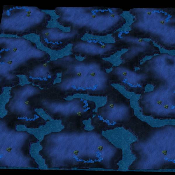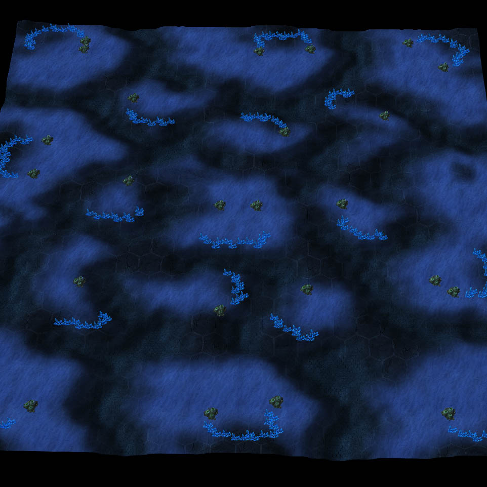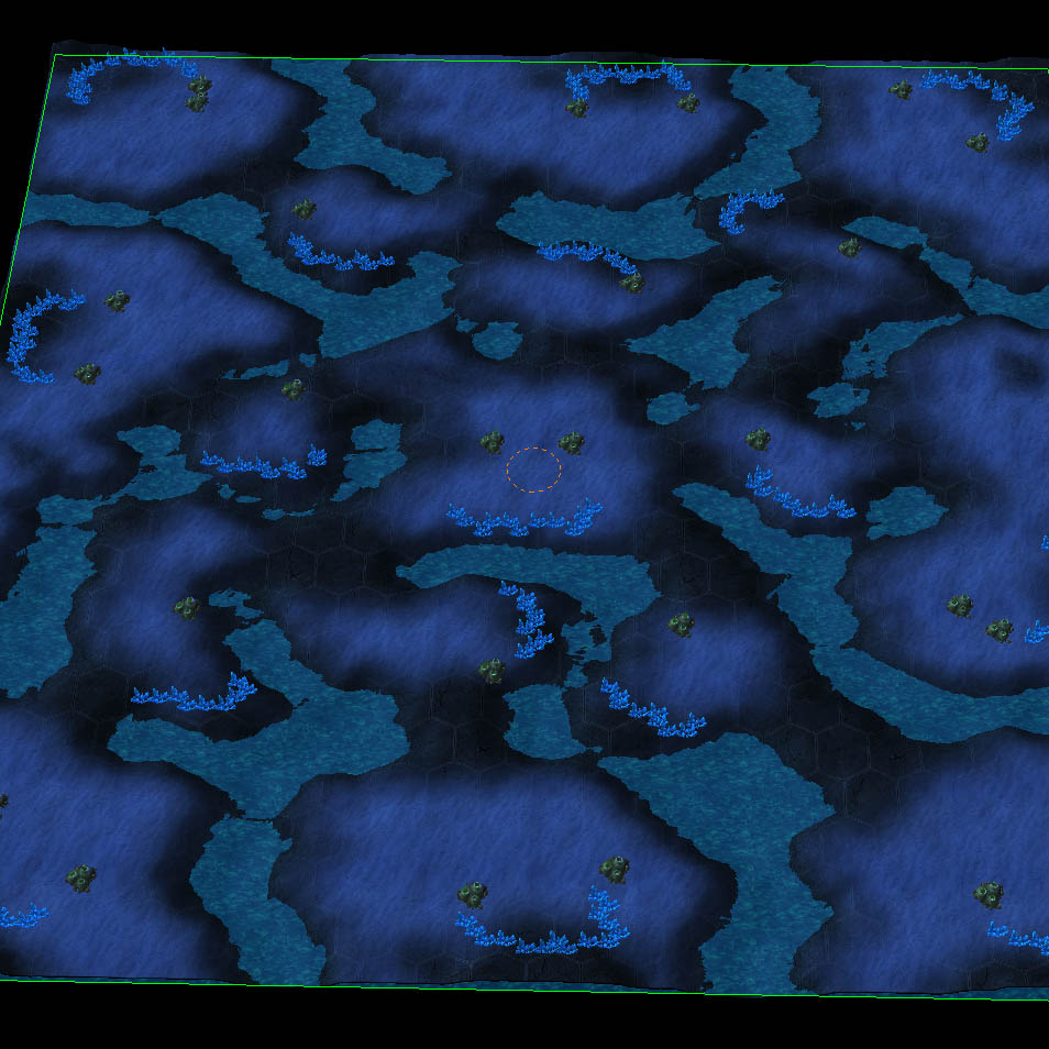 2) Получившаяся карта еще не совсем ею является, несмотря на верное расположение минералов и веспеновых гейзеров. Далее, нам все равно придется немного ее отредактировать, чтобы привести в надлежащий вид. К сожалению, из-за отсутствия поддержки клиффов, ландшафт и выглядит незавершенным, хотя редактор пытается это компенсировать, изменяя карту высот. Сначала, добавим немного воды, используя Водяную Кисть в Редакторе Рельефа.