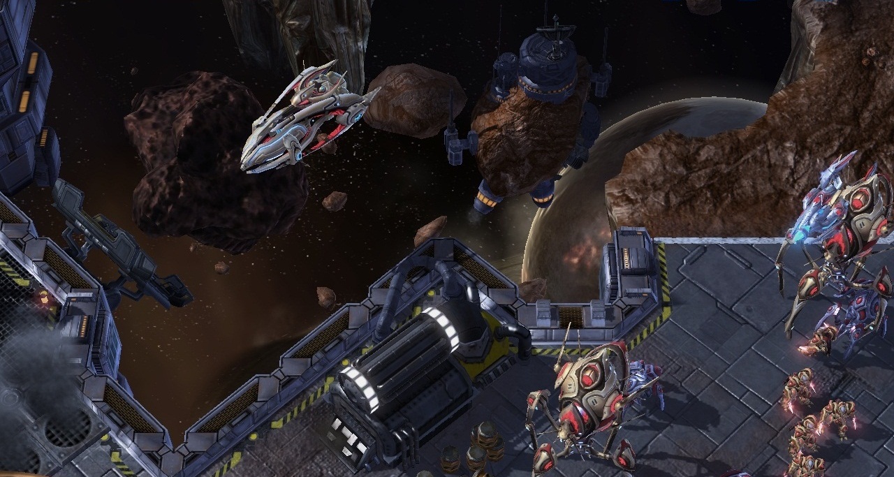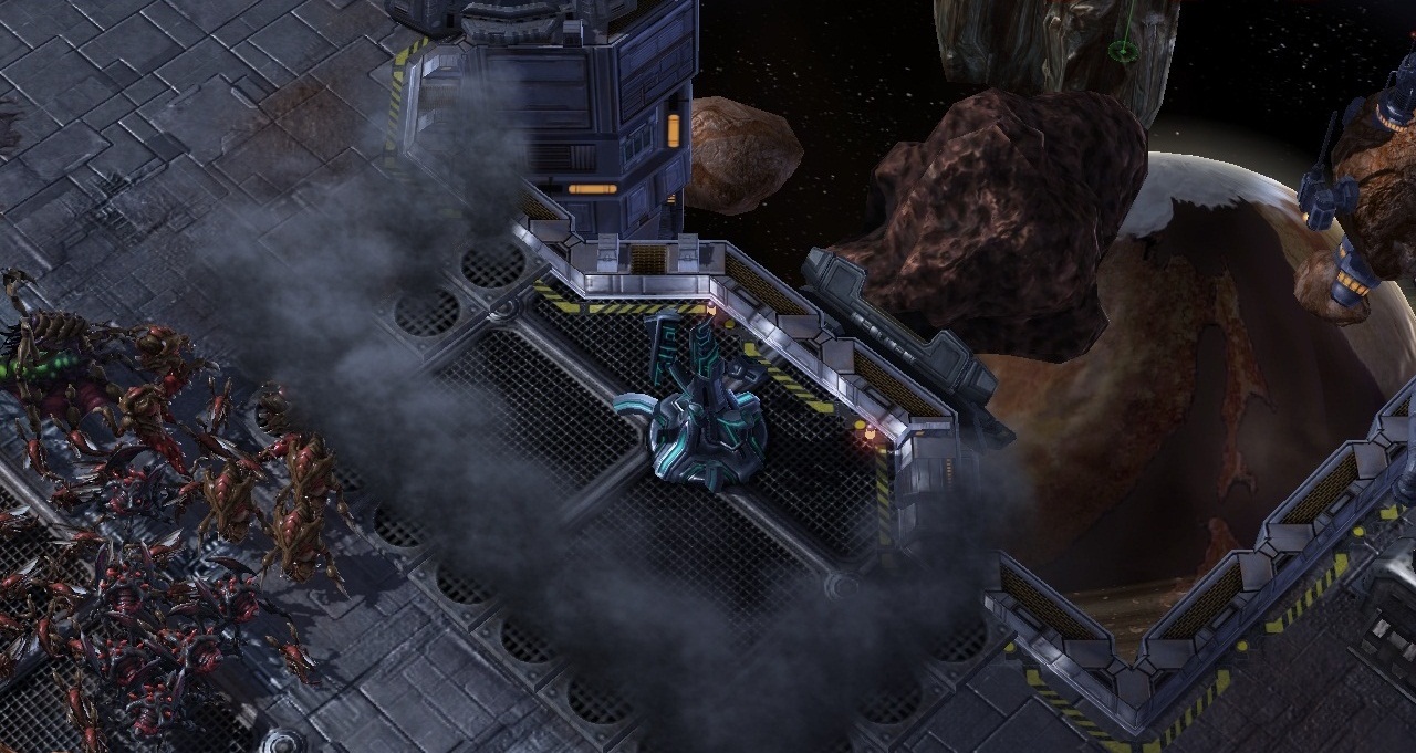 Небольшая терранская платформа на метеорите. Повсюду разрушенные сооружения, бочки, реклама, можно даже найти разобранный медивэк, но собрать или окончательно разломать не получится, обидно. Вокруг станции опасно парят куски метеорита. На заднем плане видна окольцованная планета.