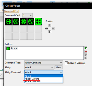 - Attack Ground - Атакует выбранную точку поверхности (Очень важно, чтобы первый эффект оружия единицы Impact Location имел выбранный Target Unit/Point. Иначе будет срабатывать ошибка