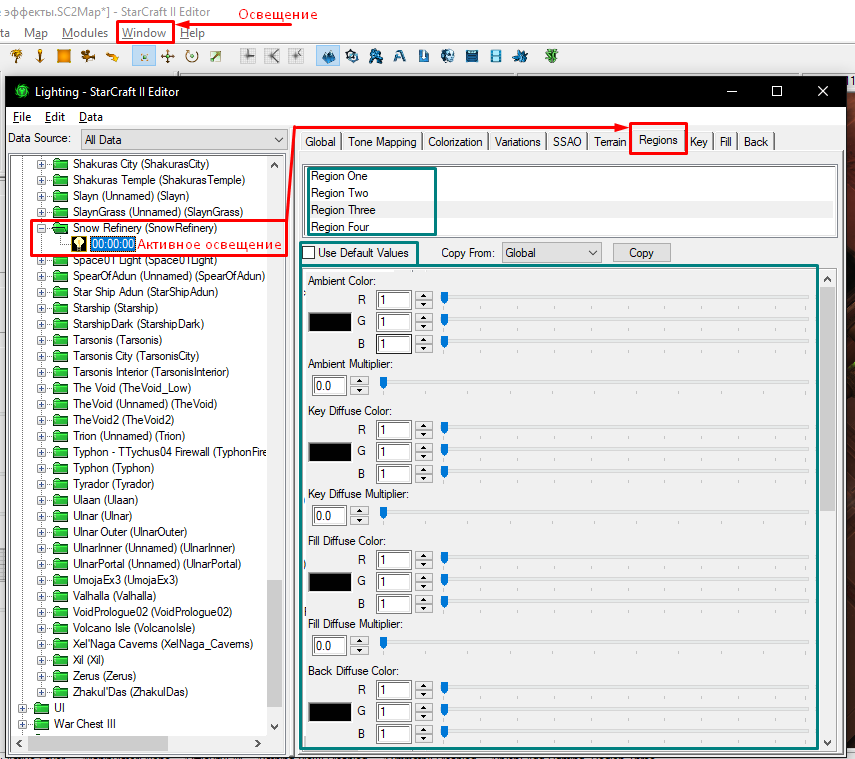 Доступно 4 разных региона поверхности. Первым регионом залита вся карта по умолчанию,