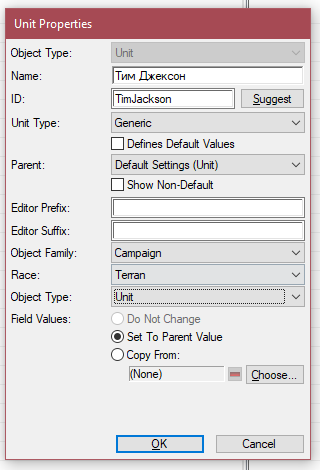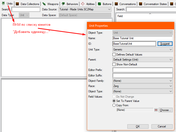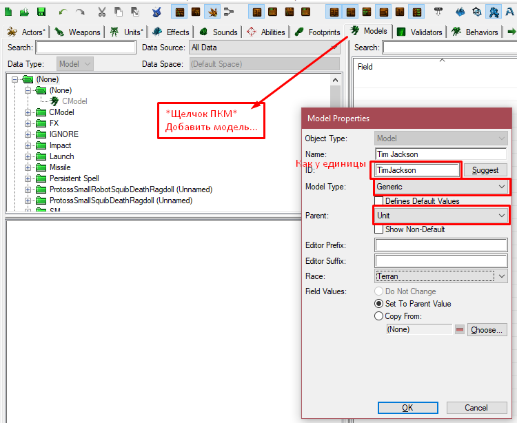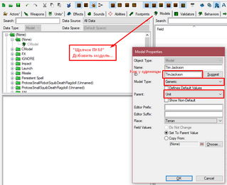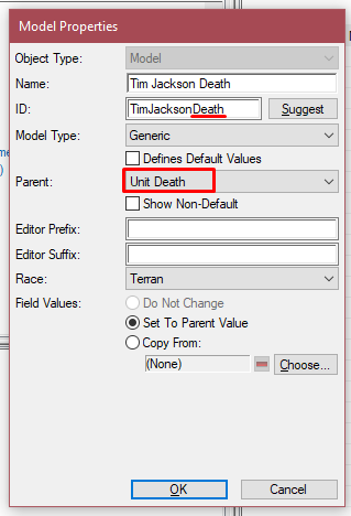 Также как создали обычную модель, создаём и модель смерти. Но единственное, в окне создания выбрать "родителя" Unit Death, а также ID указать как ID единицы с суффиксом Death. Затем просто указываем модель смерти в поле Model