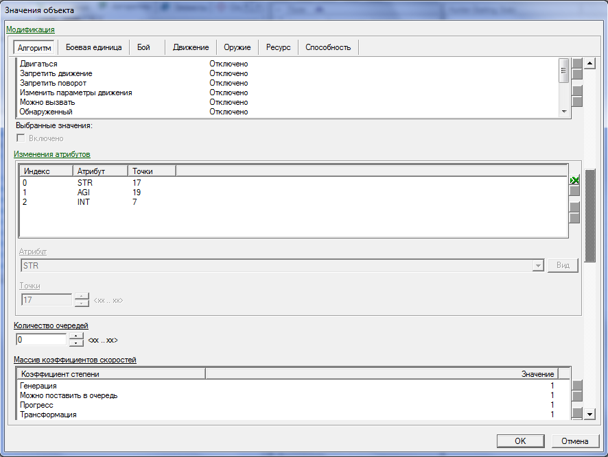 Теперь "Agility". В списке модификаций найдите Коэффициент скорости атаки/Attack Speed Multiplier. В этом поле поставьте величину <1+x>, где x - бонус к скорости атаки за единицу характеристики. Например, 1.05 для бонуса 5% (я не полностью уверен, что это правильно, но на практике похоже на то).