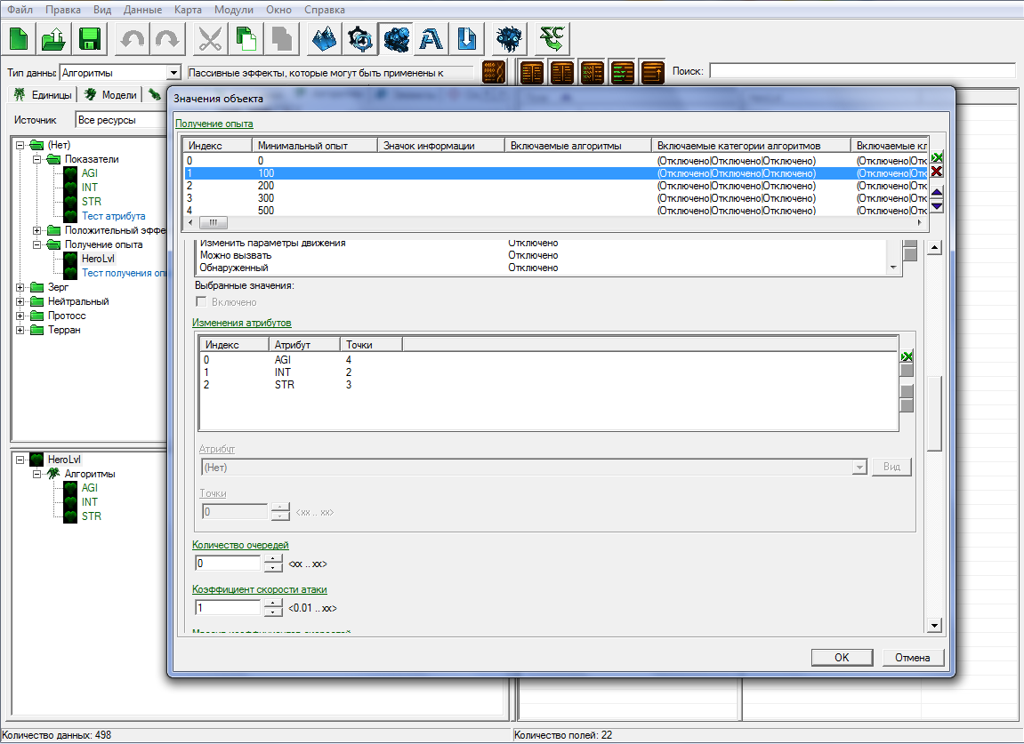 - непонятно, как задавать начальное количество атрибутов (на 1 уровне). Наверное, придется делать это триггерно, я в триггерах видел действие по добавлению алгоритмов "в штуках", но не пробовал пока