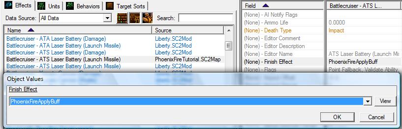 2.3 Сейчас мы должны добавить в "Battlecruiser - ATS Laser Battery (Launch Missile)" созданный выше еффект, для появления на цели баффа.