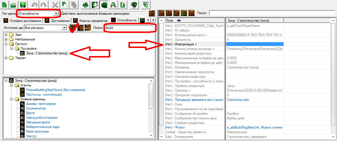 В окне Данные (Data Editor), укажем Способности (Abilities) в качестве Типа данных (Data Type). В строку поиска вводим ключевое слово "build" (прим. - чтобы результат поиска выглядел так же, как и на скриншоте, необходимо включить опцию "Отображать список объектов как дерево").