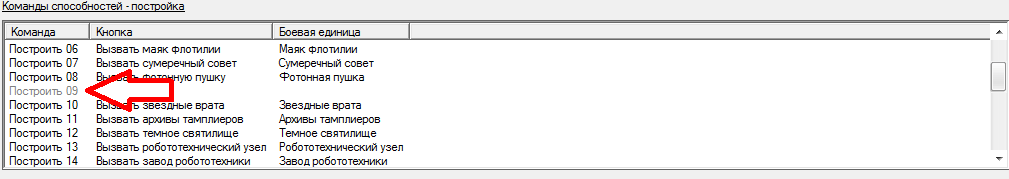 Выберем указанную способность и в таблице свойств отыщем поле (Нет) - Информация+ ((None) - Info+), выполним на нем двойной клик левой клавишей мыши - откроется список зданий, установленных по умолчанию. Прокрутим его немного вниз и найдем незаполненную строку Постройка 9 (Build 9).