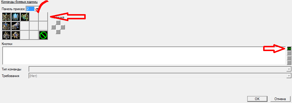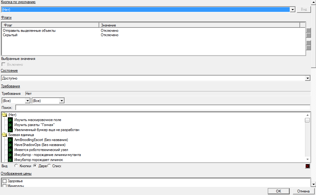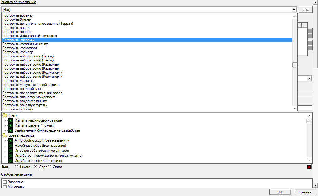 Да здесь же куча опций! Первая, которая нас интересует, расположена в верхней части окна - определение внешнего вида нашей кнопки здания. В список, что расположен ниже надписи Кнопка по умолчанию (Default Button), отыщем пункт Построить казармы (Build Barracks).