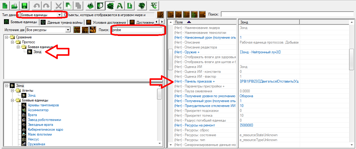 Однако мы еще не закончили. Теперь необходимо разместить новое здание в меню выбора зданий Зонда. Для этого выберем в качестве типа данных Боевые единицы (Units) и выполним поиск Зонда (Probe). Последовательно раскрываем папки Сражение (Melee) - Протосс (Protoss) - Боевая единица (Unit), и, наконец, выбираем Зонд. В таблице свойств находим (Нет) - Панель приказов+ ((None) - Command Card+) и открываем окно изменений для этого поля.