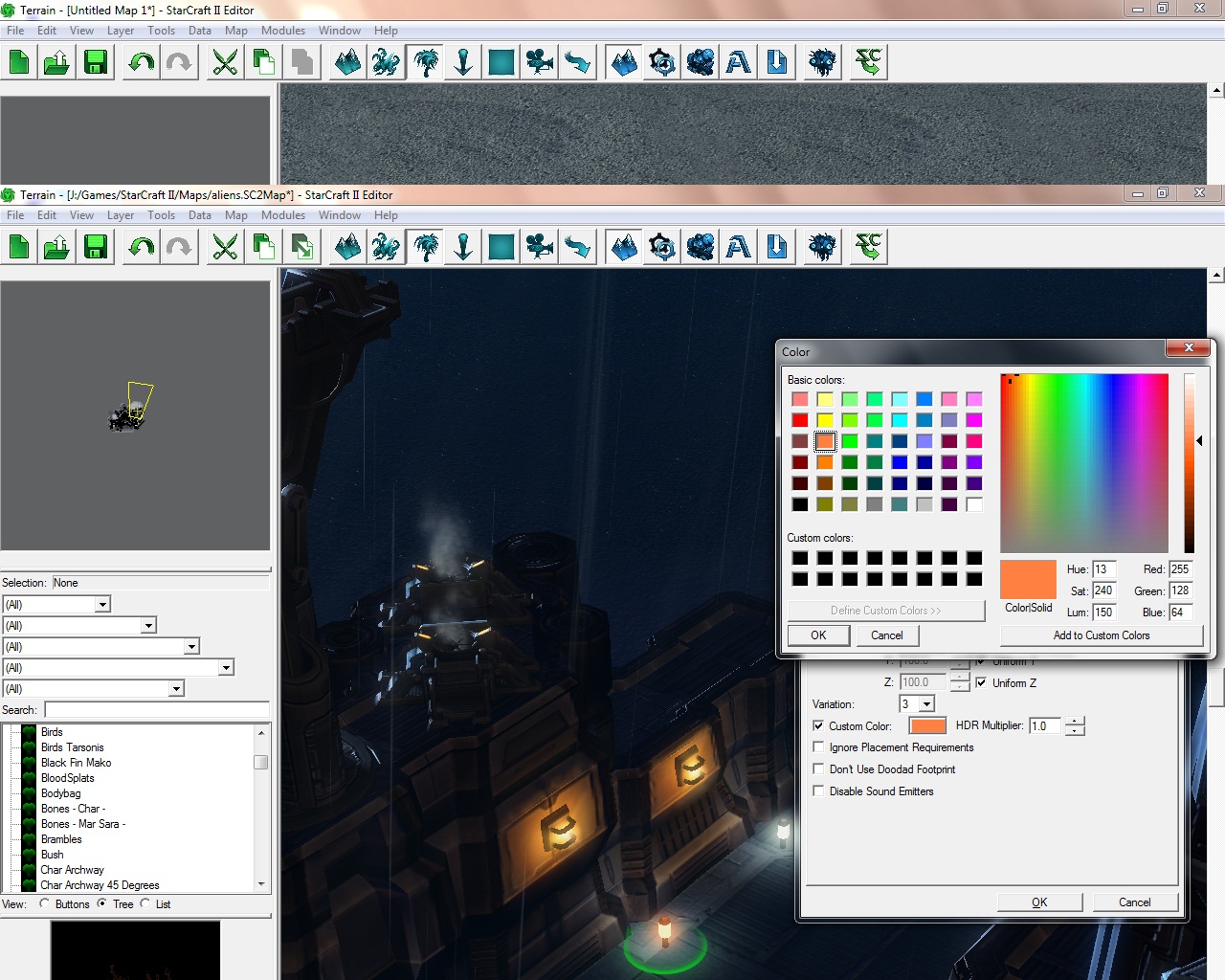Теперь открываем палетту рельефа, нажимаем на самую правую кнопку. Ищем декорацию с похожим именем. Ставим на карту. Обьект можно выделить (правда выделение никак не отобразится) и крутить при помощи / и *.