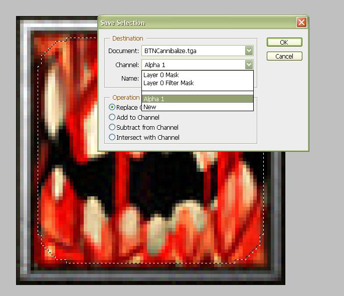 - Далее нам нужно заменить созданный только что альфа канал по нашему выделению. Следуем Select->Save Selection...(Выделение->Сохранить выделение...) и сохраняем как Channel: Alpha 1 (Канал: Альфа 1) и ставим галочку на Replace Channel(Заменить канал).