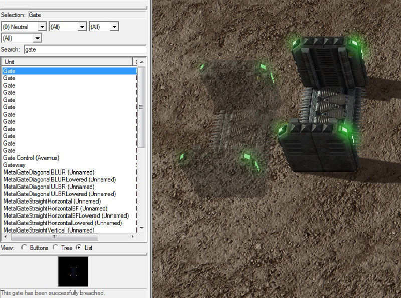 Ворота, которые я прежде разместил ещё на втором шаге, имеют тип юнита: "Разрушаемые Ворота" (DestructibleGate). Это значит, что все приказы Open gate (как и Close gate), название которых начинается с "DestructibleGate...", будут работать на этом юните.