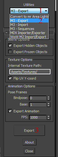 Для того что бы экспортировать Вашу модель в формат m3, запустите скрипт «M3 – Export» (цифры 1 и 2). Запустив скрипт, Вы увидите пару настроек, которые уже правильно стоят по умолчанию и путь к текстурам модели (Internal Texture Path). Если Вы все проверили, записали нужный Вам путь к текстурам, по умолчанию он стоит как «Assets/Textures/». Лучше его не менять, т.к. большинство моделей используют именно такой путь. После можете смело жать кнопку Export(3).