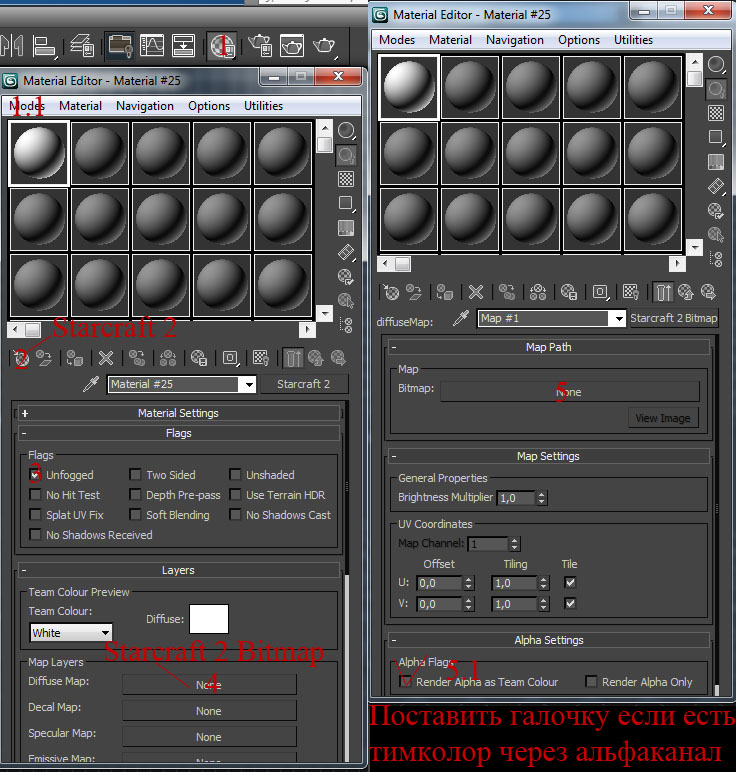 После того как Вы сделали это, нажмите на кнопку «None» напротив Diffuse Map (4). Затем откроется список материалов, выберите Startcraft 2 Bitmap, после чего нажмите на кнопку «None» напротив надписи «Bitmap:», появится окошко в котором обязательно выберите именно 3DS Max Bitmap, следом за этим выберите Вашу текстуру(5), уже конвертированную в формат dds или tga. Если на текстуре есть альфа канал для тимколора, поставьте галочку напротив надписи «Render Alpha as Team Colour» (5.1).
