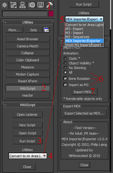 Выберите эти скрипты в «Utilities»(4-5), если они не открылись после нажатия Run Scripts. В настройках(6) поставьте галочки напротив пунктов All, Bone Rotation и Import as M3.