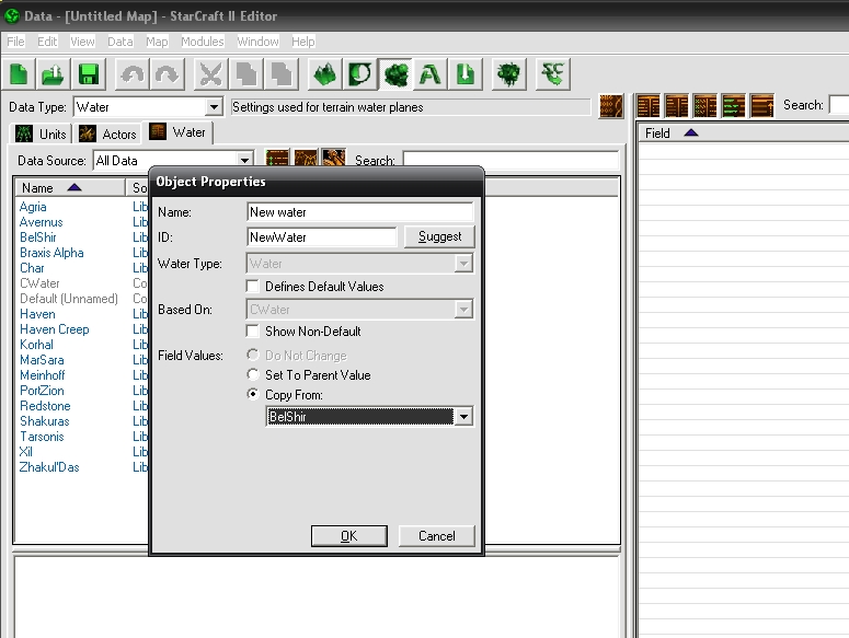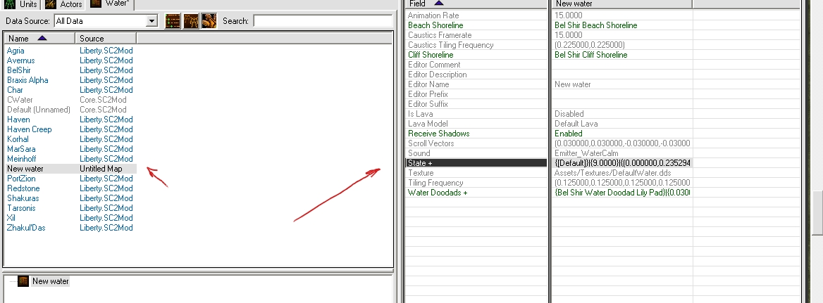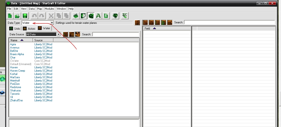 Главное, о чем бы я хотел рассказать - это создание разных уровней воды. Чтобы создать новый уровень воды необходимо зайти в Data Editor и выбрать Data Type - Water