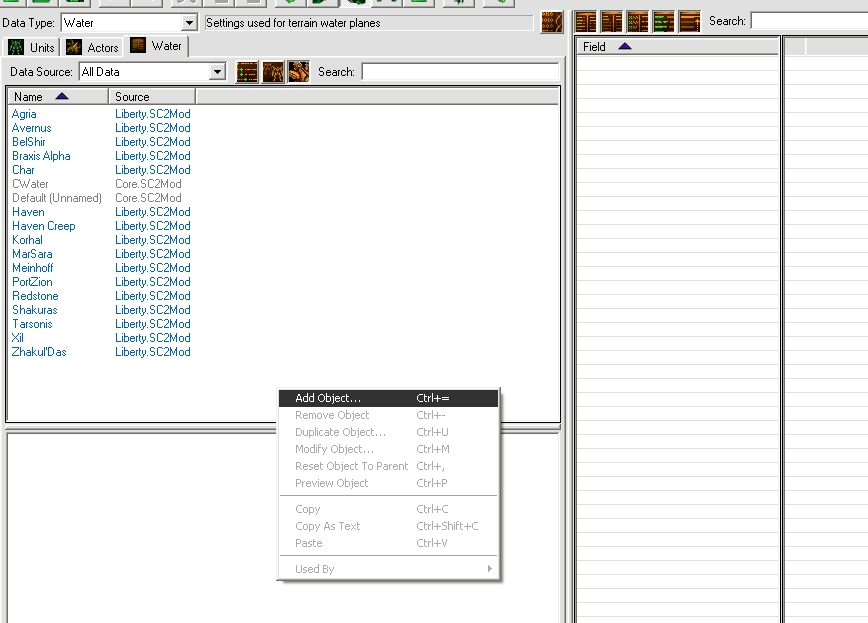 Далее кликая правой кнопкой мыши по полю с типами воды, добавляем новый обьект