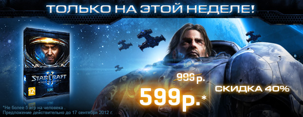 Только на этой неделе вы можете приобрести StarCraft II: Wings of Liberty по цене 599 р. при оформлении покупки на сайте battle.net для своей учетной записи. Это на 400 р. меньше обычной цены! Будьте готовы к европейскому финалу StarCraft II World Championship Series на этих выходных. Потренируйтесь с друзьями в сетевом режиме – добавьте немного старого доброго хаоса и целенаправленных разрушений в сектор Копрулу!