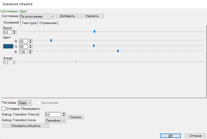 Высота: позволяет менять высоту текстуры, есть, как общая высота (на левой панели, там где добавить/убрать воду), так и локальная высота для состояния