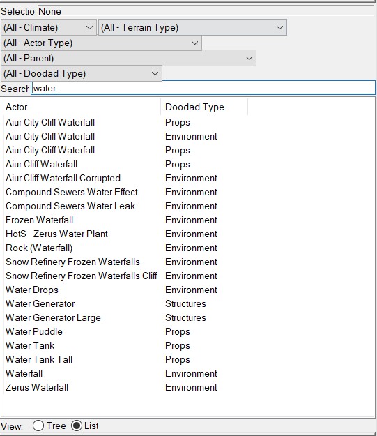 Для выбора декораций наберите в поиск "Water" и вы увидите весь список декораций связанных с водой